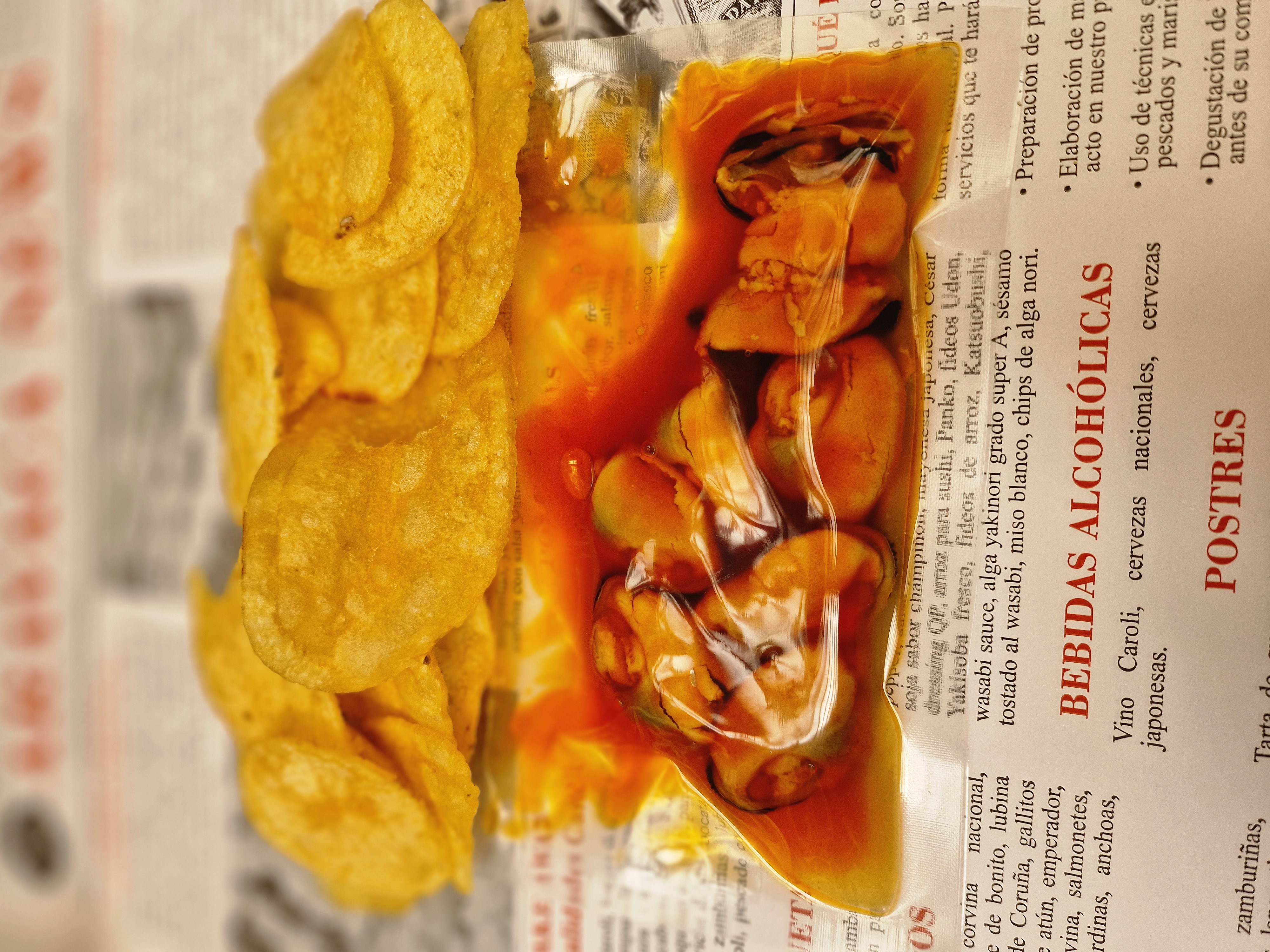 Mejillones fritos en un sabroso escabeche con un toque de laurel.